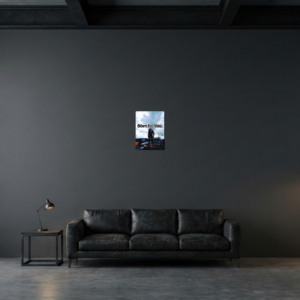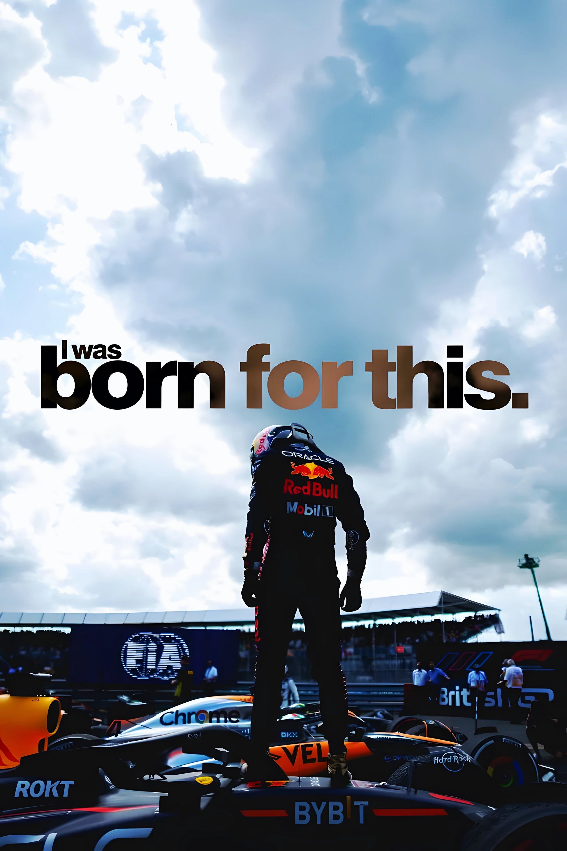 This high-octane sports visual captures Formula 1 champion Max Verstappen standing atop his Red Bull Racing car in a moment of triumph. The dramatic low-angle perspective against a towering, cloud-filled sky emphasizes his dominance, while the bold "I was born for this." typography reinforces a mood of destiny and elite competitive drive.
