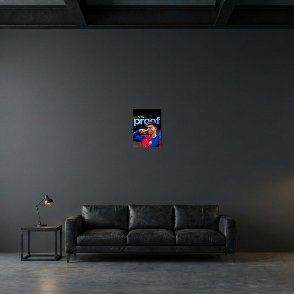 This high-energy sports graphic features the rising football sensation Lamine Yamal in his FC Barcelona kit. The composition captures the young star in a moment of celebration, highlighting his youthful confidence against a dark, atmospheric stadium background. Overlaid with the bold, blue typography "Be the proof," the design serves as a powerful motivational piece, celebrating the breakthrough of a new generation in elite sport.